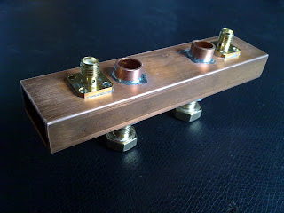 The capacitors are 2 x M8 brass screws centred (with a small air gap) within two copper tubes. I cut 2 threads in the bottom wall of the waveguide to support the screws, the tubes are soldered to matching holes in the the upper wall.